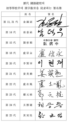 針對(duì)漢字缺失導(dǎo)致的韓國(guó)文化危機(jī),韓國(guó)健在的歷屆國(guó)務(wù)總理21人中,日前有20人聯(lián)合簽名建議書(shū)敦促實(shí)施漢字教育,并被提交給韓國(guó)總統(tǒng)李明博。