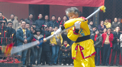 參賽人員中,年齡最大的徐先玉老太今年已72歲,她是著名的“長江大俠”呂紫劍高徒之一。她的3節(jié)棍舞得虎虎生威,時而踢,時而戳,時而伏,贏得觀眾一片叫好。據(jù)徐介紹,當(dāng)年她出生3天母親就因病過逝,父親作為國民黨的一名軍官,四處打仗無法管她,她被武功超強的姑姑收養(yǎng),并拜她為師。有一次,投誠后的父親在監(jiān)獄里偶然與“長江大俠”呂紫劍相識,遂托他尋找流落在重慶的女兒。