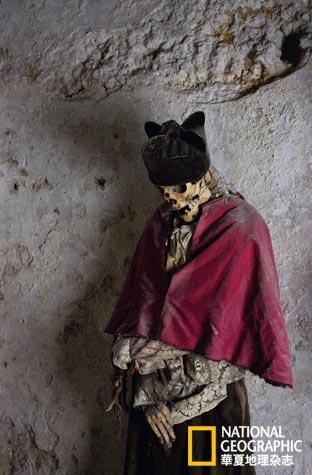 美麗小鎮(zhèn)諾瓦拉有一座規(guī)模宏大、富麗堂皇的教堂。祭壇前方有一扇通向地下密室的暗門,只需撳動(dòng)一個(gè)隱藏的按鈕,電控開關(guān)就會(huì)把門打開,如同007電影中的情景。下了臺(tái)階就能看到一列壁龕,存放著衰敗程度各不相同的主教尸體。他們坐著鑿了些圓孔的小石椅(供體液滲流),面容僵直,像是在一起享受公廁里的放松時(shí)刻。一座擺滿了頭骨的高架子上有個(gè)盒子,里面裝著兩具自然干化的貓尸,恍若古埃及的魅影。它們困在這地下墓室里,提醒著人們:即使真有九條命,歸宿也只有一種。 (來源:《華夏地理》雜志 )