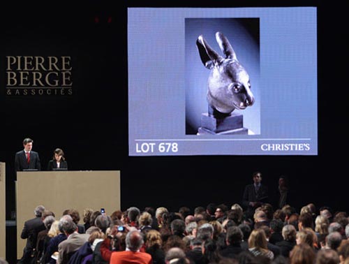 當(dāng)?shù)貢r間2月25日,佳士得拍賣行在巴黎大皇宮舉辦的“伊夫·圣羅蘭與皮埃爾·貝爾熱珍藏”專場拍賣會上拍賣圓明園流失文物鼠首和兔首銅像,在不到5分鐘的時間里,兩件文物分別以1400萬歐元被買家通過同一電話代理人買走。