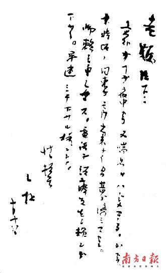 最令人關(guān)注的是,展覽中還展出了魯迅寫于1936年10月18日凌晨的絕筆信(復(fù)制品),這封信寫給好友內(nèi)山完造,讓內(nèi)山幫忙請醫(yī)生前來診治。信中用日文寫道:“老板幾下:沒想到半夜又喘起來。因此,十點鐘的約會去不成了,很抱歉。拜托你給須藤先生掛個電話,請他速來看一下。草草頓首L拜 十月十八日!庇浾呖吹,信上字跡很難分辨,筆力不深、草草書寫,可以想見當時魯迅身體已極度虛弱。寫完這封信的次日,魯迅先生就與世長辭了。