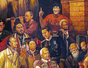 這幅畫可謂讓網友們開了眼,從來沒見過誰把如此眾多中外知名人物畫在一幅畫面中的,更何況還把這些名人們拼接得如此妙趣橫生、天衣無縫,大有天下大同之感?植婪肿永蔷驼驹诓际采砗螅杉己购湍闷苼霾Ⅰ{齊驅,搖滾明星崔健站在慷慨激昂的列寧身后,而他旁邊就是手拿書卷的希臘行吟詩人荷馬,而亞里士多德的手正扶在比爾·蓋茨的肩上,比爾·蓋茨身前是球王貝利,就在他的旁邊,手拿大刀的關云長和希特勒一起在聆聽貝多芬的琴聲,不遠處雷鋒叔叔帶著他熟悉的笑容望向畫面之外,而在畫面中央的圓桌旁,斯大林和達·芬奇則比鄰而坐,毛澤東和林肯促膝而談……簡直就是一幅世界名人的全家福。