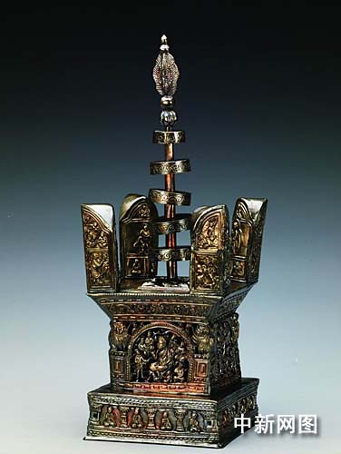據(jù)浙江省博物館工作人員介紹,安放在雷峰塔天宮內(nèi)的“五代鎏金純銀阿育王塔”,及其塔內(nèi)供奉舍利的金瓶,在雷峰塔倒塌時(shí),此塔被嚴(yán)重壓扁,2008年底成功修復(fù),因此這次赴臺(tái)是在臺(tái)灣的首次亮相。而“唐五代鎏金銅釋迦牟尼佛說(shuō)法像”造型精美,釋迦牟尼佛結(jié)跏趺坐于盤(pán)龍托舉的蓮座上,身后是鏤空火焰紋大背光,靜謐的佛、張揚(yáng)的龍、升騰的烈焰,三者的精妙組合成就了一件藝術(shù)佳作。