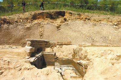 汪大猷墓位于余姚市大隱鎮(zhèn)下磨村后山。記者昨天趕到現(xiàn)場(chǎng),老遠(yuǎn)看到一座山,幾乎半個(gè)面都被開(kāi)掘出來(lái),相當(dāng)壯觀。沿著泥沙路往上走,路慢慢地變窄。不一會(huì),前方出現(xiàn)一條亂石鋪成的道路。參與此次考古發(fā)掘的考古隊(duì)隊(duì)員羅鵬告訴記者,這是墓前的神道,以前神道兩旁各有對(duì)稱的石羊、石馬、石虎和石人4對(duì)石像生。不過(guò)年代久遠(yuǎn),其中幾座遭到損壞,現(xiàn)尚有4座保存在村民家中。記者眼前只見(jiàn)磚頭搭起的基座。