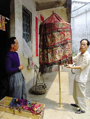 記者見(jiàn)到,兩頂官傘里襯均是純麻布,外層分別用白、紅、黃三種優(yōu)質(zhì)綢布縫制而成,外表繡有獅子、龍、鳳和牡丹花等物;傘撐開(kāi)時(shí),高約1.2米,直徑0.8米。
