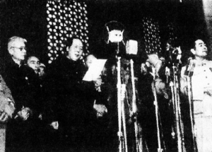 周恩來總理和中蘇友協(xié)會長宋慶齡、副會長劉少奇到前門車站歡迎。團(tuán)長是蘇聯(lián)著名作家、蘇聯(lián)作協(xié)總書記法捷耶夫,代表團(tuán)中還有著名作家西蒙諾夫與好些有名的藝術(shù)家及高級干部,全團(tuán)約有40多人。當(dāng)時,因?yàn)榭陀^環(huán)境和條件的限制,未能邀請外國的政府代表團(tuán)或政黨代表團(tuán)參加。這個蘇聯(lián)的民間代表團(tuán),與已經(jīng)在京的朝鮮人民代表團(tuán),加上一個來解放區(qū)訪問的意大利共產(chǎn)黨中央委員斯巴諾,是有幸出席開國大典的僅有的外國人了。蘇聯(lián)的代表團(tuán)剛剛安頓下來,下午就興奮地登上了天安門城樓。