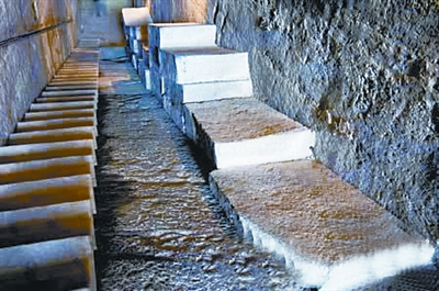 與連環(huán)翻板功能類似的,是鐵索吊石。主要是在墓道頂和墻壁隱蔽處固定若干金屬滑輪,利用滑輪將巨石吊起,懸于頂端。墓道地下鋪木質蹺板,索鏈由石板而下,通過滑輪以隱蔽的方式連接蹺板,中間有掛鉤和脫鉤相接,遇外力壓迫可自動脫落。蹺板呈條狀,長寬根據墓道具體情況而定。吊起之石可在墓道頂部懸掛三層,各層互不相依,索鏈通過石上孔洞收縮進出。