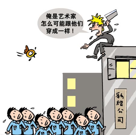 “我是搞藝術(shù)的人,喜歡個(gè)性張揚(yáng),卻偏偏把我整得跟他們一模一樣!”日前,因不滿公司統(tǒng)一制服,且設(shè)計(jì)提成未給足,廣州某公司工業(yè)設(shè)計(jì)經(jīng)理彭同學(xué)第三次報(bào)警,且以跳樓絕食相要挾。