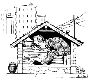 陳四益回憶中,丁老有著老一輩知識分子的風(fēng)骨,他說:“他的生活一直很艱苦,但是他從來不挑挑揀揀。”當(dāng)年,丁老師給巴金等作家的書配插畫時,正在美術(shù)館做給畫貼標(biāo)簽的工作,他就是在那些標(biāo)簽紙上畫書的插圖的。丁老師的住房條件一直十分艱苦,房子很小,最后屋子里東西堆到放不下,他就只好自己去租了一間老房子搞創(chuàng)作。(如圖丁聰漫畫《書中沒有黃金屋》)