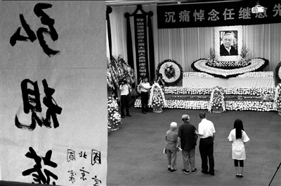 任繼愈老先生的靈堂設(shè)在國(guó)家圖書(shū)館南區(qū)學(xué)術(shù)報(bào)告廳。靈堂內(nèi),簇?fù)碇卫线z像的黃白菊花讓人感到肅穆和哀傷。