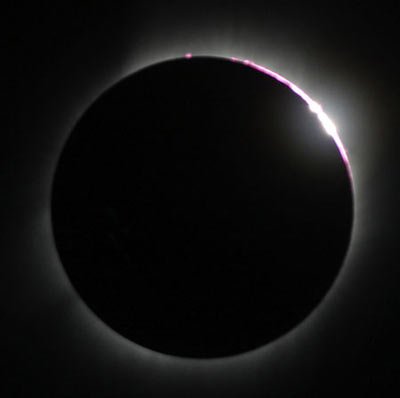 月亮繼續(xù)往東移動(dòng),當(dāng)月面的西邊緣和日面的西邊緣相內(nèi)切的瞬間,稱為生光,它是日全食結(jié)束的時(shí)刻。在生光發(fā)生之前,鉆石環(huán)、貝利珠的現(xiàn)象會(huì)出現(xiàn)在太陽(yáng)的西邊緣,但很快就會(huì)消失。接著在太陽(yáng)西邊緣又射出一線刺眼的光芒,在日全食時(shí)可以看到的色球?qū)印⑷甄、日冕等現(xiàn)象迅即隱沒(méi)在陽(yáng)光之中,星星也消失了,陽(yáng)光重新普照大地。