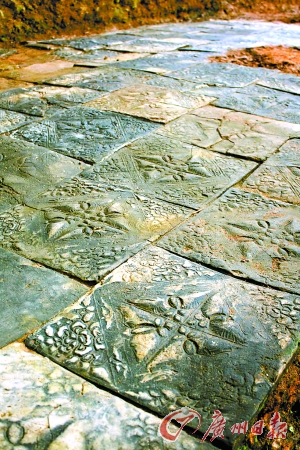 東回廊地面是兩種不同的地臺磚,上層磚呈長方形,規(guī)格為20厘米×30厘米,底下一層呈正方形,每個邊長40厘米。專家分析,上下不同規(guī)格的地臺磚,說明南漢王朝統(tǒng)治的55年期間回廊地面也經(jīng)過了幾次修整。