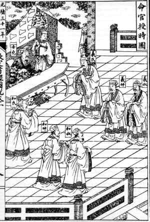 制定歷法,就是“觀象授時”,對統(tǒng)治者來說是最重要的事情。天文歷法象征著帝王“君權(quán)神授”的統(tǒng)治權(quán)威。傳說堯帝就命天文學(xué)家羲、和二氏進行天文觀測以制定歷法!渡袝虻洹氛f:“乃命羲和,欽若昊天,歷象日月星辰!碑(dāng)時是以觀測日出方位和黃昏時中天的恒星來確定季節(jié)。根據(jù)書中記錄的“中星”天象,可以推斷堯帝“觀象授時”的年代約在公元前23世紀(jì)。當(dāng)時制定的歷法是一年有366天,以置閏月的方法保持與季節(jié)同步。