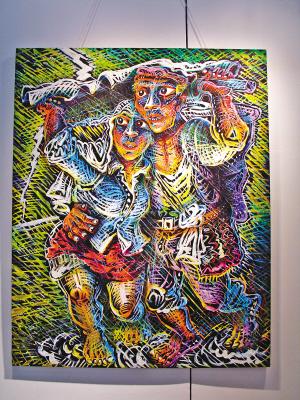 據(jù)介紹,在120位參展藝術(shù)家中,就有13位重慶藝術(shù)家,除了羅中立、傅文俊、李一凡三位參加主題展的藝術(shù)家外,還有10位來自川美的藝術(shù)家進(jìn)入了新人特區(qū)展。羅中立四幅最新力作首次展出也是雙年展另一個(gè)焦點(diǎn)。昨日,記者在現(xiàn)場看到,羅中立的四幅作品分別是《下梯的農(nóng)婦》、《過河系列一》、《吹燈》、《雷雨》,內(nèi)容都圍繞鄉(xiāng)村愛情。但在昨日的開幕儀式上,羅中立和陳丹青都因故沒有出席。