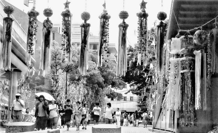 鳥住貞義先生還給我放了一段去年七夕時,枚方市祭掃“七夕神社”的錄像,我看到,前往祭掃的人除了“七夕研究會”的成員外,還有當(dāng)?shù)氐淖h長、市府官員以及許多民眾。在“七夕神社”的周圍栽了很多竹子,前往祭掃的大人小孩都將自己的心愿寫在一張長紙條上,然后掛在竹子的枝條上,用來祈福。這使我想起日本小鈞市的“七夕文化”,也牽涉到兒童,“七夕”這天早上,凡年滿6歲的兒童在媽媽的陪同下,到野外的莊稼上取些露水回家,然后用露水磨墨寫字。這是一種儀式,代表兒童從這一天起,就開始啟蒙讀書寫字了。據(jù)我考證,這是日本和中國“七夕文化”略有不同的地方,其他如七夕夜放河燈,為牛郎與織女照明祝福;一家人在庭院里擺上桌子,沏上香茶,一邊品茶一邊觀看牛郎與織女相會天河的美景;在葡萄架下側(cè)耳傾聽牛郎與織女相會時的絮語;姑娘在絲瓜架下默默地向天上‘乞巧’,盼望自己能像織女那般心靈手巧,這些幾乎是相同的!跷/圖 湯禮春