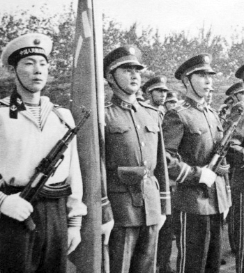 10月1日國(guó)慶6周年閱兵,受閱官兵全部著新式軍服,佩戴軍銜、領(lǐng)章,意氣風(fēng)發(fā),精神抖擻,邁著鏗鏘有力的步伐接受檢閱,展示了人民解放軍實(shí)行軍銜制后的新面貌。佩戴元帥、大將軍銜的解放軍高級(jí)將領(lǐng)們?cè)谔彀查T上檢閱部隊(duì)后,穿著新式軍服興致勃勃地在天安門城樓上合影留念。