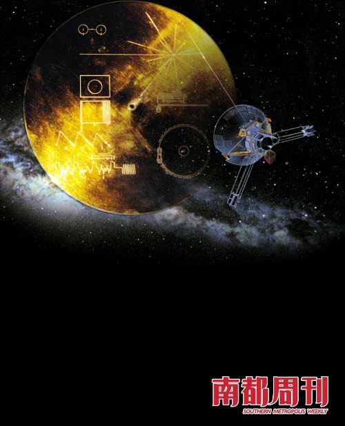 兩艘“先驅(qū)者號(hào)”飛船上都安裝有一個(gè)金屬板,它可謂是地球人送給外星人的“名片”。金屬板的左側(cè)刻有太陽(yáng)系的圖案;右側(cè)刻有一個(gè)男人和一個(gè)女人的圖像,男人在招手致意;下方刻有太陽(yáng)及太陽(yáng)系九大行星的編碼。在兩艘“旅行者號(hào)”飛船上都裝有送給外星人的“郵包”:一個(gè)圓形鋁盒,里面放著一張鍍金視聽光盤。讀取光盤數(shù)據(jù)的說(shuō)明寫在鋁盒的蓋子上。光盤上收錄了 115張圖片,介紹了地球文明最重要的一些資料 (如中國(guó)萬(wàn)里長(zhǎng)城、脫氧核糖核酸的分子式等);錄有地球人用 55種語(yǔ)言向外星人發(fā)出的簡(jiǎn)短問候;存有 35種聲音信息;還有地球人的音樂文化(如巴赫的作品、爵士樂、中國(guó)名曲《高山流水》等)。