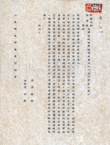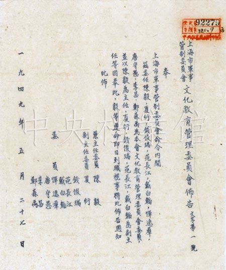 上海解放后,上海市軍管會(huì)成立,下設(shè)軍事、政務(wù)、財(cái)政、文化教育四個(gè)方面的接管委員會(huì)。1949年5月29日,上海軍管會(huì)文化教育管理委員會(huì)派軍代表接管大中華唱片廠。6月2日,大中華唱片廠恢復(fù)生產(chǎn),灌制了解放區(qū)歌曲《解放區(qū)的天》、《軍隊(duì)向前進(jìn)》、《唱?jiǎng)倮、《蔣家兵呀一團(tuán)糟》、《向人民解放軍致敬》、《扭向新中國》、《快樂的農(nóng)村》等七種,準(zhǔn)備由各廣播電臺(tái)播送。8月,以“人民唱片”為牌號(hào)出版唱片。到年底,共出版60個(gè)牌號(hào),約1萬張粗紋唱片,其中有歌曲《東方紅》、《國際歌》、《咱們工人有力量》、《贊美新中國》以及歌劇、民樂、京劇、越劇、川劇、滬劇、山東快書等。