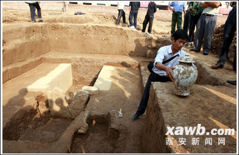 在地宮墓葬南側(cè)約4米遠(yuǎn),考古人員還發(fā)掘出一個(gè)更為少見(jiàn)的墓葬。這是一個(gè)距現(xiàn)地表約1米深的長(zhǎng)方形豎穴墓坑,長(zhǎng)約1.5米,寬約0.8米,其內(nèi)置放一個(gè)高約70厘米、直徑約80厘米的大陶缸,缸口用一大陶盆覆蓋,內(nèi)中有一具呈盤坐姿態(tài)的完整骨架,周圍填有木炭屑及麥草等。張全民介紹說(shuō),這是一個(gè)僧人的坐化真身,即其彌留之際以盤坐姿待逝,留下完整尸身歸葬。其葬式也可稱甕棺葬,所填充的木炭等物用以吸潮防腐,也確實(shí)起到了作用。