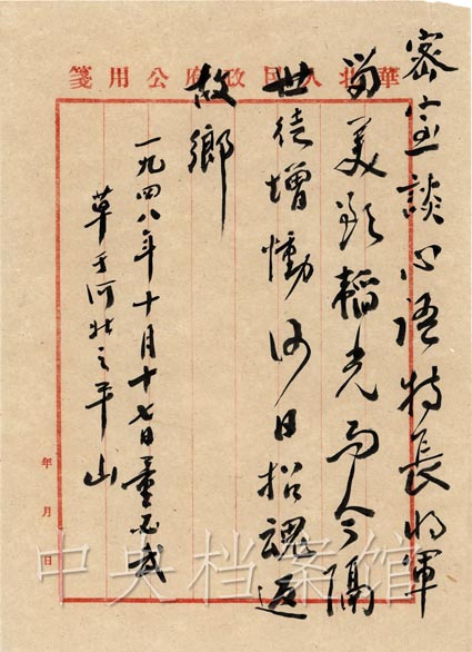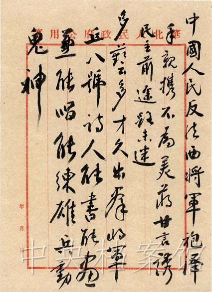 1949年 9月 1日,馮玉祥遇難周年祭日追悼會在北京舉行,出席者有李濟(jì)深、宋慶齡、周恩來、沈鈞儒、張瀾、何香凝、郭沫若、林伯渠、吳玉章、董必武及馮玉祥夫人李德全等 600余人。毛澤東、朱德及各民主黨派、各人民團(tuán)體送了挽聯(lián)花圈。毛澤東親筆題詞: “馮玉祥將軍逝世周年紀(jì)念謹(jǐn)致悼意。 ”周恩來在致詞中說:馮玉祥先生從一個(gè)典型的舊軍人轉(zhuǎn)變成為一個(gè)民主的軍人,他經(jīng)過了曲折的道路,最后走向新民主主義的中國。馮先生堅(jiān)決地拒絕了美帝國主義對他的誘惑,毅然離美準(zhǔn)備回到中國解放區(qū),接受參加新政治協(xié)商會議的號召,不幸遇難,實(shí)值得大家紀(jì)念。