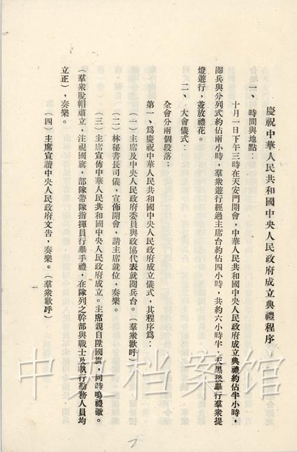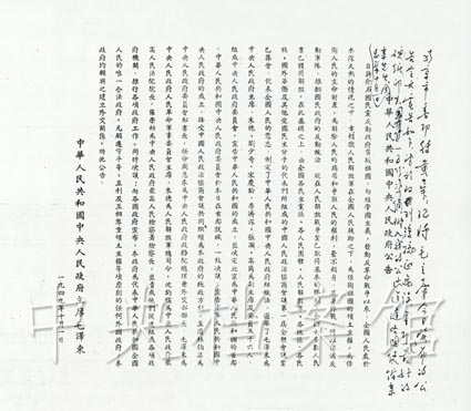 毛澤東主席莊嚴宣布:“中華人民共和國中央人民政府已于本日成立了!辈⑶矣H手升起國旗——五星紅旗。升旗儀式后,毛澤東宣讀《中華人民共和國中央人民政府公告》。
