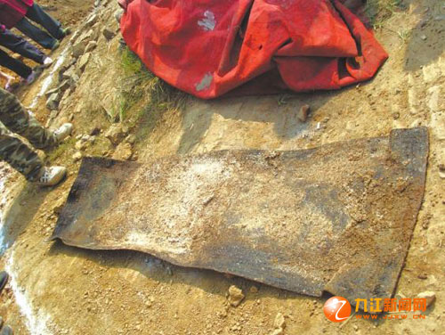 第二天上午記者聞?dòng)嵹s到現(xiàn)場,見到一座五六米高的土坡被掘去一半,古墓的白灰空洞懸在土坡切面的半腰處,棺木散落在土方旁。泥地上有一大攤水漬,有人提醒道,別踩著,那是從棺材里流出來的水。女尸已被人用廢舊的紅地毯裹卷著,停放在不遠(yuǎn)處的平地上,旁邊還有一張潮濕的舊篾席。后來獲知席子原先墊于尸首下,是從棺木中取出的。仔細(xì)一打量,篾席上長時(shí)間壓出的人形痕跡清晰可見。圍觀的人越來越多,不時(shí)有人上前,欲掀開地毯一睹新奇,好在兩個(gè)民警一旁維持秩序,好事者才不敢妄動(dòng)。
