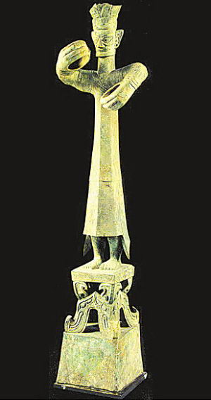 那么,“縱目”的蠶叢是什么樣子?在四川省廣漢市三星堆兩個(gè)商代大型祭祀坑中的上千件蜀國(guó)珍貴文物面世之前,歷代學(xué)者百思不得其解。三星堆出土的縱目青銅面具和青銅大立人,據(jù)考古學(xué)家論證,就是蠶叢的形象。這使得自古以來真?zhèn)文娴墓攀袷穫髡f成為信史,也為蠶叢縱目的傳說提供了實(shí)物佐證。