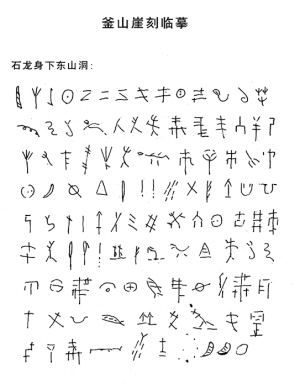 此外,釜山的崖洞內(nèi)還留有109個“古文字”。經(jīng)專家推測,這些“古文字”均為上古黃帝時代人類留下的符號,但其用意和內(nèi)容目前仍然無法破譯?脊湃藛T在研究對比中發(fā)現(xiàn),釜山崖刻和史前出土的刻畫符號有相同的,與早期青銅器上的刻畫符號也有相同的。這說明釜山的摩崖石刻不僅繼承了仰韶時期的特點,同時又發(fā)展到了青銅器時代。這些刻畫符號的上限是公元前5000多年,下限是先商時期,大致相當(dāng)于黃帝“合符”的年代。