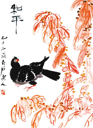 《和平鴿》是一幅以動(dòng)物為主體的上乘之作。齊白石一生對(duì)生活充滿熱愛(ài),其筆下花鳥蟲魚,乃至蟬、蝶、蟋蟀等小昆蟲,皆充滿情趣,寄托和凝聚著他內(nèi)心的天真與童趣。鴿子是白石老人很喜愛(ài)的題材,他曾親自飼養(yǎng)鴿子,觀察其體態(tài)神韻,創(chuàng)作態(tài)度嚴(yán)謹(jǐn)。該畫右側(cè)是一叢鮮艷的雁來(lái)紅,兩株并立,一株斜插,枝葉披紛,繁而不亂。在紅花之下,站立著一只通體漆黑、紅嘴紅爪的和平鴿,雙目圓睜,回首眺望,極顯精神。鴿子雖是大寫意畫法,但結(jié)構(gòu)造型精準(zhǔn)。此畫僅黑紅二色,卻營(yíng)造了熱烈而穩(wěn)重的氛圍。題款“和平、九十二歲白石老人”不僅點(diǎn)明主題,而且在全畫以“面”為主的構(gòu)圖中,制造了“點(diǎn)、線”元素,使作品形式更為豐富。