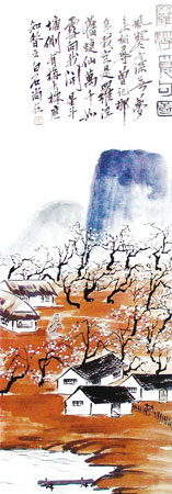 白石老人以花鳥創(chuàng)作為主,但也偶作山水,并能把花鳥畫的一些技法運(yùn)用到山水畫中,別有清新明快之感!读_浮覓句圖》是一幅精彩的山水畫作品,此作取全景式構(gòu)圖,布局宏大:遠(yuǎn)處羅浮山巍峨聳立,設(shè)色單純明快,虛實(shí)相映,凸顯空間之感;山下赭色的坡地上則是梅林如海,白梅綻放,梅香陣陣;林中屋舍隱顯,高士攜童覓詩(shī);近景水波微瀾,渡頭空曠,具有濃郁的文人情懷。該畫的技法簡(jiǎn)捷,沒(méi)有傳統(tǒng)山水畫的“勾、皴、染、點(diǎn)”的繁復(fù)創(chuàng)作程式,而是以大寫意手法縱筆平涂,別具簡(jiǎn)約質(zhì)樸的生活情趣。在色彩上,大片泥土的赭石紅,也與遠(yuǎn)山淺藍(lán)綠的花青色形成鮮明對(duì)比,顯得非常精神。題詩(shī)“風(fēng)寒冬深無(wú)夢(mèng)來(lái),相尋曾記那年栽;定是羅浮舊蜨仙,萬(wàn)千如雪向我開(kāi)”,詩(shī)畫相配,令人心馳。