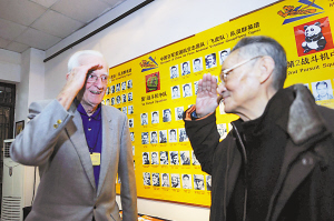兩位老人興奮地用手臂模擬飛機(jī),以手勢(shì)交流著飛行心得,兩人不時(shí)會(huì)心一笑。鮑勃說,他在電視上偶然看到了中國還有一名健在的飛虎隊(duì)員在重慶,于是到處打聽來重慶的旅行團(tuán),并且委托旅行團(tuán)領(lǐng)隊(duì)一定要聯(lián)系到龍啟明。