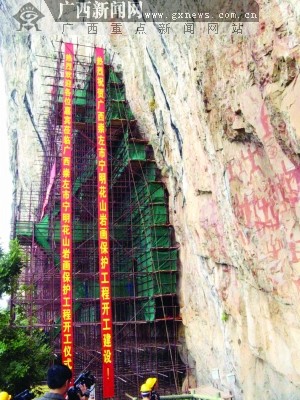 昨日上午,在簡(jiǎn)短而隆重的開工儀式后,廣西崇左市寧明花山巖畫保護(hù)工程正式開工;ㄉ綆r畫保護(hù)前期工作長達(dá)18年,僅在方案研究、材料試驗(yàn)和方案設(shè)計(jì)等工作上就耗時(shí)5年,其所動(dòng)用的學(xué)科領(lǐng)域和專家之廣、所耗資金之多,不僅在廣西文物保護(hù)史上史無前例,就是在中國文物保護(hù)史上也極為罕見,而此次開工的第一期搶救性加固工程被專家稱為“要干救命的活”。那么等著“救命”的花山巖畫其病害危重到什么程度?為什么前期工作要花費(fèi)那么長時(shí)間?一期保護(hù)工程將使用哪些先進(jìn)技術(shù)?我們以后還能不能看到它的原貌?記者在保護(hù)工程現(xiàn)場(chǎng)進(jìn)行了采訪。