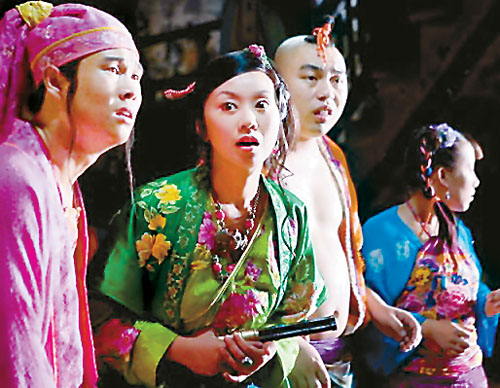 其一,全片表現(xiàn)以“鬧劇”式的敘事假定性(擬古而又將年代模糊化,中英語錯雜使用),劇中角色一個個俱成了從屬于“無厘頭化”情節(jié)進(jìn)程的符碼,遺去原版人物之“神”而僅存其形、其皮,全都平庸而了無新意。諸如張三、李四、王麻子再饒上兩個添油加醋的小小伙計趙六與陳七(毛毛扮演);ㄉ200萬美金買來的這個版權(quán),如此做法,不但堪稱極盡奢侈的浪費,同時也標(biāo)示了主創(chuàng)者創(chuàng)意能力的喪失而淪為匠藝般的“東施效顰”。
