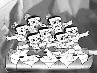 的確,在大多數(shù)人看來,整部《葫蘆兄弟》完全是一個(gè)集體作品。即使胡進(jìn)慶身兼多職參與了《葫蘆兄弟》的導(dǎo)演、編劇和形象設(shè)計(jì)工作,觀眾也很難發(fā)現(xiàn)這一點(diǎn)。在片頭的字幕中,他用了三個(gè)不同的名字,胡進(jìn)慶、進(jìn)慶,還有他的筆名“墨犢”,“不然都是我一個(gè)人的名字,多難看!
