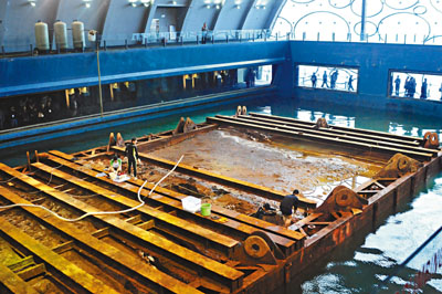 博物館主場南海一號古船所在的沉箱,考古隊員正進行一場水下考古挖掘的動態(tài)演示。經(jīng)過幾天的放水調(diào)試,沉箱的其中兩個探方已微露船舷。據(jù)稱,沉箱仍不會立即打開,這是為了保護古沉船的微環(huán)境?脊湃藛T將采取逐層打開的措施,一點一點地發(fā)掘,同時,也有3名蛙人在水下作業(yè)。