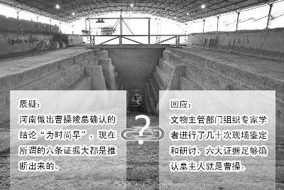 對(duì)于學(xué)者質(zhì)疑,河南省文物局副局長(zhǎng)、新聞發(fā)言人孫英民進(jìn)行了回應(yīng)。他表示,曹操陵墓本身爭(zhēng)議很大,河南省文物局對(duì)于曹操陵墓的確認(rèn)和發(fā)布非常慎重——從2009年10月開(kāi)始發(fā)現(xiàn)有證據(jù)表明可能為曹操陵墓后,國(guó)家文物主管部門先后組織了歷史學(xué)、考古學(xué)、古文字學(xué)、人骨鑒定方面專家學(xué)者,進(jìn)行了幾十次現(xiàn)場(chǎng)鑒定和研究討論,最后得出的結(jié)論是,目前掌握的六大證據(jù),足夠確認(rèn)墓主人就是曹操。河南省文物局根據(jù)專家意見(jiàn),報(bào)經(jīng)國(guó)家文物局同意之后,對(duì)外統(tǒng)一發(fā)布了曹操陵墓確認(rèn)的消息,整個(gè)過(guò)程是嚴(yán)謹(jǐn)和慎重的。