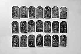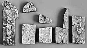 墓地出土(或從盜墓賊處繳獲)的石牌和石枕,有關(guān)方面認(rèn)為是根本性的確證。圖一中有兩塊石牌寫著魏武王大戟,這是很有意思的,因?yàn)槲覀兛吹降氖鞘撇皇俏淦麝旧怼E谱邮钦f明實(shí)物的,如何根據(jù)牌子證明這就是曹操的墓地呢?牌子上面寫著魏武王常用格虎大戟,表明這是在說明商品的名稱,而不是說這是曹操的遺物。再看圖二計(jì)21枚牌子,這些牌子上面都有孔,以作懸掛用,上面寫的多是物品名數(shù),如胡粉二斤、黃豆二升之類。如果把這些看成是遺物陪葬,那就不免奇怪了。因此這些所謂遺物應(yīng)該是陳列的商品招牌,那么這幾間陰室要么是做過倉庫,要么就是堆放過商品。而這些牌子只是為了說明記錄這些貨物用的。從稱呼上看,曹操生前先封為“魏公”,后賜九錫,進(jìn)爵為“魏王”,死后謚號(hào)為“武王”,其子曹丕稱帝后追尊為“武皇帝”,史稱“魏武帝”。出土石牌、石枕刻銘稱“魏武王”,名稱倒是不錯(cuò),但石枕形貌不是生活中可以適用的物品,應(yīng)該出自偽造。從物品所刻字體看,刻工水平很差,所以只能是來自民間藝人所作,因?yàn)閺谋I墓人手中獲取,也不排除盜墓人游戲之作。
