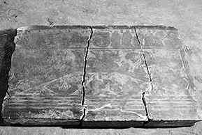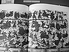 圖四是山東嘉祥出土的漢代畫像石。山東嘉祥的漢代畫像石內(nèi)容為垓下之戰(zhàn)。畫面分為三層。第一層是項(xiàng)羽問路,老農(nóng)詒曰向左,結(jié)果項(xiàng)羽陷大澤中。第二層是在長堤上,長堤就是垓下,項(xiàng)羽將手下分成四隊(duì),向四方。最下層是烏江亭長駕駛船請項(xiàng)羽上船,項(xiàng)羽背過身,不肯回江東。洛陽曹操墓出現(xiàn)的這塊石頭顯然是正中間的一部分,這種畫不會(huì)是孤立的,說明這個(gè)石頭是從別處抬來的。
