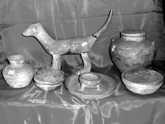 除去隨身配飾,墓室內(nèi)出土的 132 件文物中,陪葬品多為陶器。包括灰陶制作的全套灶具,陶鴨、陶狗、陶鵝等。連玉璧、玉圭等傳統(tǒng)陪葬物品,也均由石璧、石圭代替,極為簡樸。