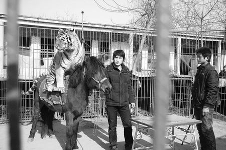 梅正川說,梅莊人馴虎已有近百年歷史。清朝末,有梅莊人開始以街頭現(xiàn)場馴獸表演為生,時(shí)間久了仿效者增多,平庸的表演已難以維持生計(jì),一些人開始引入東北虎表演,贏得了市場,并摸索出一套獨(dú)特的馴虎方法。