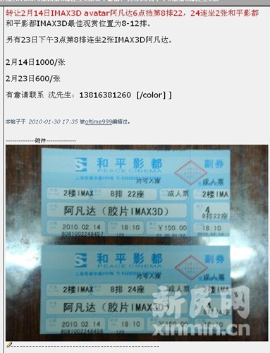 2月14日阿凡達(dá)IMAX票已炒至1000元!和平影都2月影票自1月29日開售起,便掀起新一輪購票狂潮。新民網(wǎng)記者近日在各大論壇及購物網(wǎng)站上看到,2月份影票大多已飆至500元,2月14日晚6點(diǎn)場次已炒至1000元。對(duì)此,和平影都總經(jīng)理王伯政表示:“‘黃牛’不得了,這也不是我能管的。”