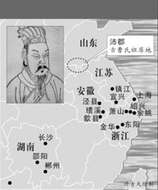 通過對這一百多件族譜的全面查閱、辨別梳理,曹操后裔可能的分布遷移圖逐漸顯現(xiàn),甚至精確到縣——古曹氏主要在漢時名為沛郡的地方活動,也就是如今江蘇北部、安徽的一部分、河南到山東交界地區(qū)。從族譜的反映情況來看,此后曹家發(fā)生了很大的遷徙,方向往南走的居多,且主要是分布在長江流域,如浙江的東陽、蕭山、紹興、余姚、金華,江蘇的宜興、鎮(zhèn)江,安徽的涇縣、歙縣、績溪,湖南的郴州、益陽、長沙,甚至包括上海。