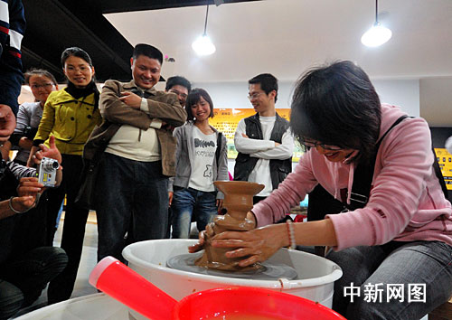 制作現(xiàn)場(chǎng)上,優(yōu)美動(dòng)聽的古箏樂曲不停地繚繞盈耳,瓷藝家們或捏或雕,或刻或鏤,或推或接,各種傳統(tǒng)技法紛紛上陣,精彩紛呈。這行云流水般的手法、精妙細(xì)致的做工、別出心裁的設(shè)計(jì),讓參觀者看得眼花繚亂,贊嘆不已,為之折服。人們?nèi)滩蛔∩锨懊幻?xì)膩的瓷泥,轉(zhuǎn)一轉(zhuǎn)工作盤,拿一拿精致的制作工具。前來參觀的顏小姐不禁挽起袖子也親身體驗(yàn)了一回手拉坯。在轉(zhuǎn)盤的帶動(dòng)下,顏小姐雙手輕拉瓷泥,那團(tuán)柔軟的瓷泥仿佛有了靈性一般“舞蹈”起來,一會(huì)變成一個(gè)款嘴的大海碗,一會(huì)又變成一個(gè)細(xì)腰的小花瓶。舉著滿手的瓷泥,顏小姐開心地說:“太有意思了,讓我想起小時(shí)候玩泥巴的情景!彼表示:“下次有空的時(shí)候,我一定還要再來玩手拉坯,DIY一件作品做紀(jì)念。”