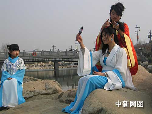 記者在現(xiàn)場(chǎng)看到,穿著大袖翩翩、交領(lǐng)、右衽的漢服,一群花樣年華的少女坐在草地上,相互打扮。有的描眉涂粉,有的盤髻插釵,有的對(duì)鏡貼“花黃”。據(jù)漢服愛好者“琉璃”透露,遠(yuǎn)在漢代,中國(guó)女子已廣泛使用口紅。從二千多年前的前漢長(zhǎng)沙馬王堆一號(hào)漢墓中出土的漆器梳妝箱中,除有發(fā)綹、梳子和香粉外、還發(fā)現(xiàn)有燕脂。 眉筆在古代又名“黛”,后漢初期,長(zhǎng)安地區(qū)的女子盛行畫“寬眉”,當(dāng)時(shí)用的是青藍(lán)色眉筆。到了唐代,則流行畫蛾須(觸角)眉。