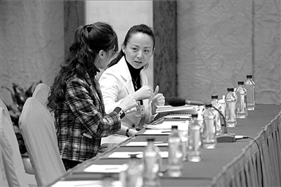 因在春晚領(lǐng)舞《千手觀音》而被百姓喜愛的聾啞委員邰麗華,每天都是第一個(gè)出現(xiàn)在政協(xié)文藝組小組討論會(huì)上。昨天下午2點(diǎn)40分,她和手語翻譯李琳剛一步入會(huì)場(chǎng),就開始認(rèn)真地準(zhǔn)備素材。她坦言,開會(huì)來得早是自身的習(xí)慣,無論什么活動(dòng)她都會(huì)提前到位。