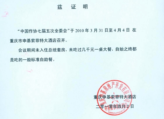 中國(guó)作協(xié)鄭重聲明:在重慶召開(kāi)的中國(guó)作協(xié)七屆九次主席團(tuán)會(huì)和七屆五次全委會(huì),沒(méi)有任何與會(huì)人員入住總統(tǒng)套房;沒(méi)有安排所謂2000多元一桌的宴席,全體與會(huì)人員用的是酒店平日標(biāo)準(zhǔn)的自助餐。會(huì)議期間,組織與會(huì)人員參觀渣滓洞集中營(yíng)舊址、“打黑除惡”資料展覽和到重慶烈士陵園祭奠掃墓等活動(dòng),都是集體乘坐大巴、中巴車往返。