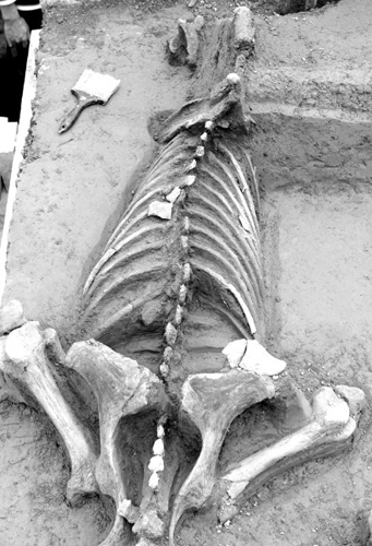 4月 12 日上午,高青陳莊遺址發(fā)掘?qū)<已杏憰?huì)在省博物館舉行,來自中國社科院、北京大學(xué)等單位的多位考古專家,對(duì)幾個(gè)月來的考古成果進(jìn)行了論證?脊湃藛T發(fā)現(xiàn)馬匹均呈“直立跪伏”狀,非常罕見。