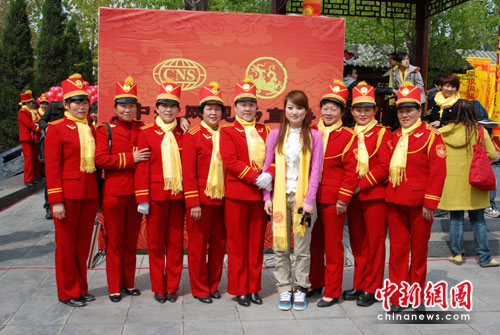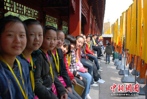 大典進行時,各項準備工作就緒,拜祖場務(wù)人員在拜祖現(xiàn)場等候各項議程的工作安排,他們“忙里偷閑”和中新網(wǎng)直播主持人合影留念。參加放飛和平鴿的兩岸四地的小朋友們靜靜坐在亭子里等候。