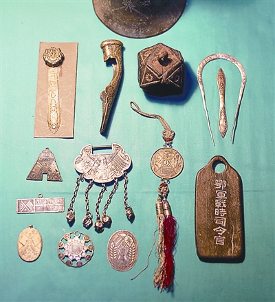 昨日,在其武昌家中,朱漢昌向記者展示了他所收藏的部分繪制有“雙旗”圖案的辛亥紀(jì)念實(shí)物,包括當(dāng)時(shí)的革命將領(lǐng)使用的佩劍手柄、軍政府的出入證、紀(jì)念章、各類(lèi)佩飾、碗碟等,其材質(zhì)涉及金、銀、銅、鐵、紙、木、瓷、皮、布等。