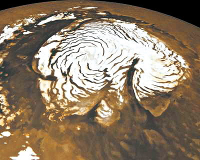 火星北極冰冠(蓋)有兩個(gè)奇異的特征,即存在著一條規(guī)模勝過大峽谷的深谷和一系列的螺旋形低谷。人們發(fā)現(xiàn)這兩個(gè)特征40年來,始終沒有能準(zhǔn)確地解釋它們形成的原因。不過這已經(jīng)成為過去,美國科學(xué)家表示,他們成功地再現(xiàn)了火星北極冰冠兩特征形成過程,從而解開了困擾人們多年的謎團(tuán)。